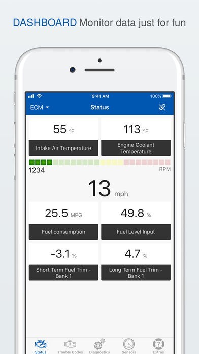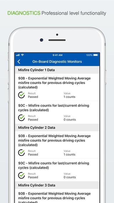 オンボード診断モニタを読み込み高度な診断を行います。診断トラブルコード(DTC)を解析して貴方の車の状態を表示します。各種パラメータやセンサーデータはリアルタイムに表示され異常検出に役立てられます。