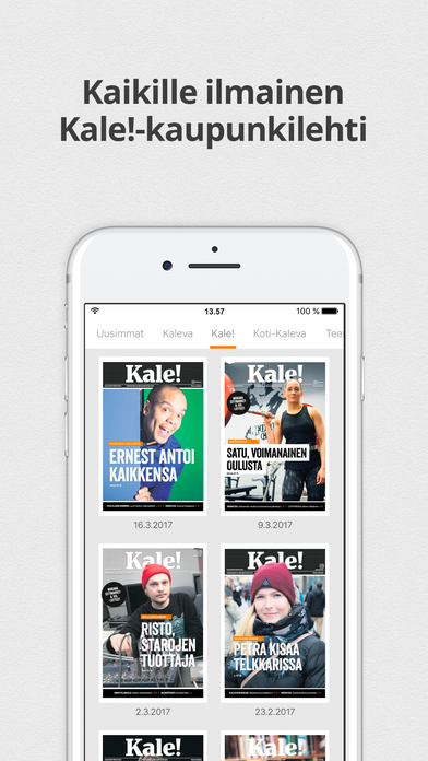 eKaleva-sovelluksesta löydät seuraavat näköislehdet: Kaleva, Kale!, Koti-Kaleva, Kalevan teemaliitteet sekä kuukauden aikakauslehdet.