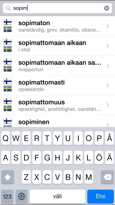 App Storeより引用This huge Finnish-Swedish-Finnish dictionary contains over 308 000 search words. Application has a selectable user interface for Finnish and Swedish.