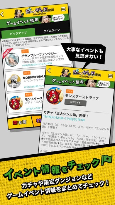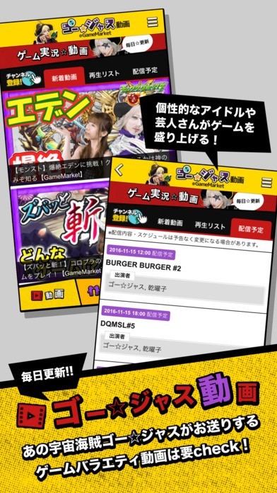 芸人"ゴー☆ジャス"によるゲーム実況動画が楽しめ、ゲームのイベント情報を逃さずゲットできる