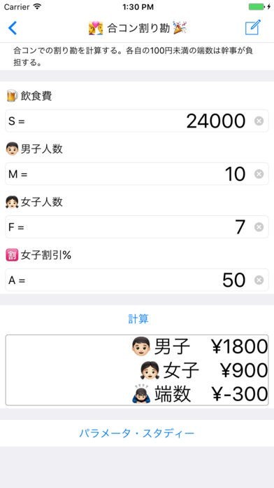 合コンの割り勘についての計算や、BMIの計算もできる機能がついている