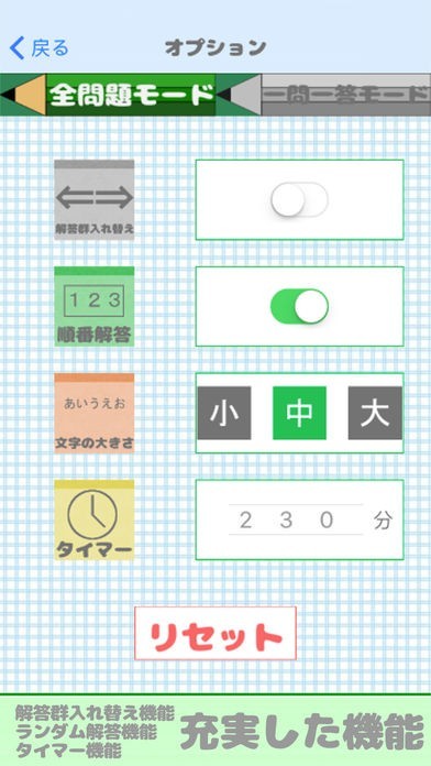 このアプリの「全問題モード」には、時間をカウントダウンしてくれるタイマー機能があります。実際の試験と同じ制限時間を設定し問題を解くことで実力を測ってみましょう。