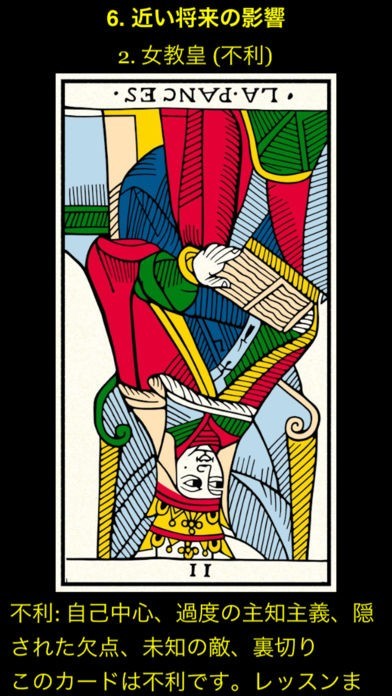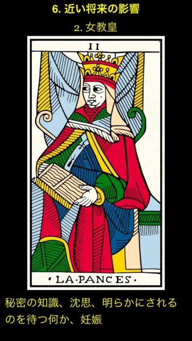 App Storeより引用このタロットはフランスのマスター・カードメイカー(彫刻の親方)であるJean-Claude Flornoy(ジーン・クロード・フローノイ)によって、ジーン・ドダルが1701年にデザインしたうちの2つしか残されていないコピーを元に丹精に復元されました。私たちが知っているタロット占いの起源になった古代ヨーロッパの神秘学におけるすべてのシンボリズム(象徴)を含んだこのタロットは、まさにタロットの母なのです。