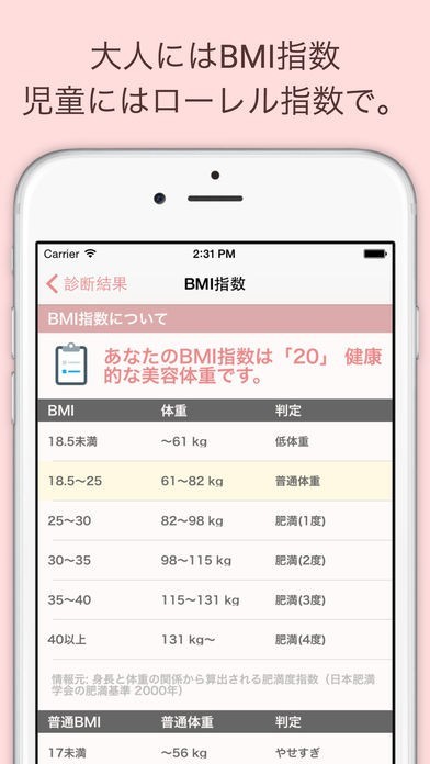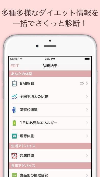 体重や身長などのデータを入力することでダイエットに関する様々な項目をまとめて診断することが出来るダイエットサポートアプリが「すごいダイエット診断」です。BMI指数はもちろん、児童にはローレル指数で診断したり、基礎代謝量や一日に必要なエネルギーなどをまとめて診断してもらうことが出来るようになっています。さらにダイエットに関する最新の情報を随時配信してくれるほか、ダイエットアイテムに関係するセール情報も配信してくれます。