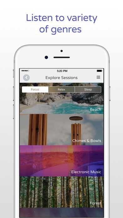 このアプリでは、AIが睡眠や集中力の質向上の為だけに開発した音楽を聴くことが出来ます。それぞれのシーン合った音楽を選んで聴く習慣をつけることで、質改善に繋がります。