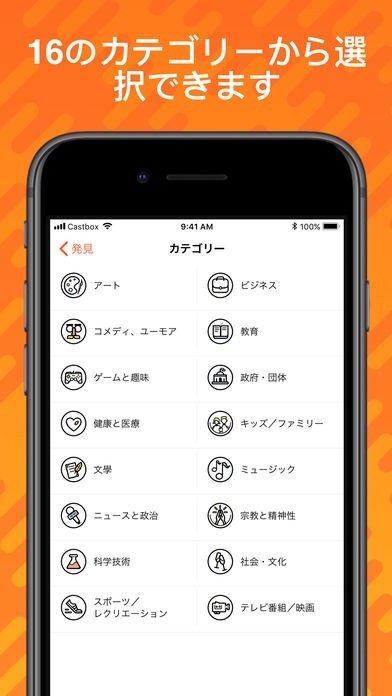 「CastBox」で楽しめるポッドキャストは16種類のカテゴリに分類されています。ビジネスや教育に関するお堅い番組から家族で楽しめるファミリー向けのコンテンツまで充実しています。