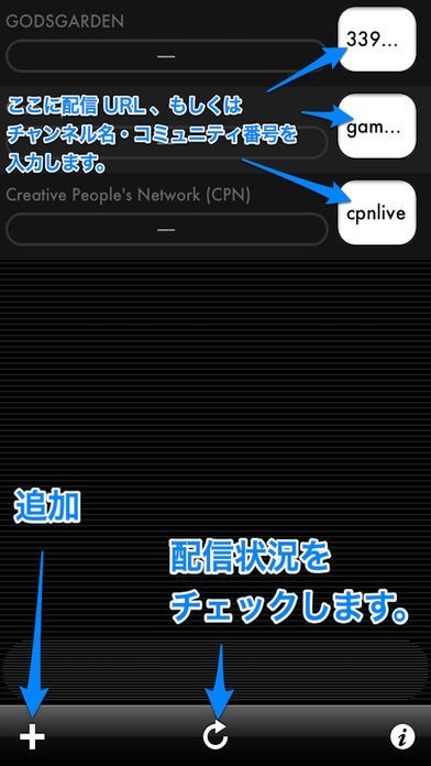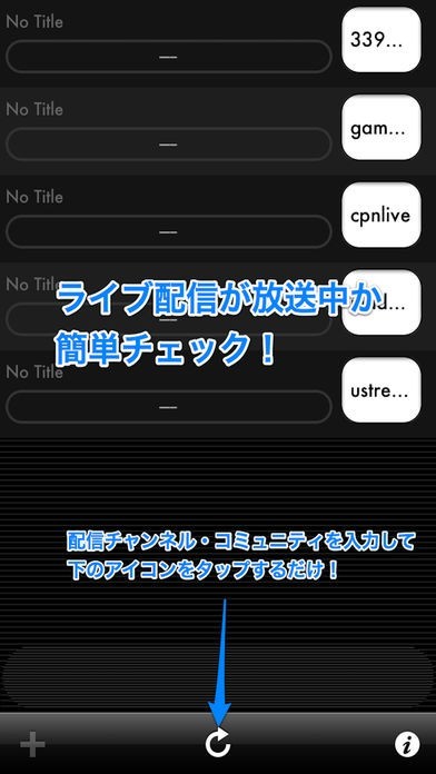 ニコニコ、ユーストリームなど、複数の配信サイトの配信情報を入手することができます。画面にあるそれぞれの配信サイト項目から、すぐに配信状況をチェックすることができます。