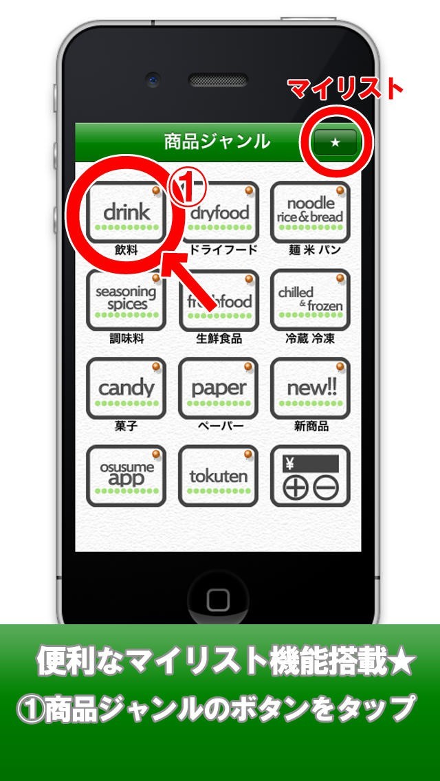 "商品ジャンル"から知りたいカテゴリのボタンをタップするだけで、わずか3タッチ以内に商品情報を知ることができます