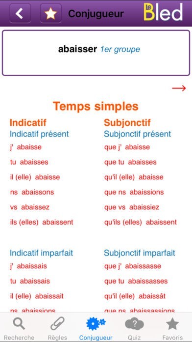 - Le conjugueur : plus de 6 000 verbes conjugués à tous les temps et tous les modes,