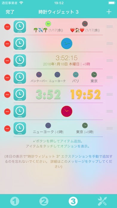 このアプリでは3つの時計ヴィジェットを出現させることができます。日本の時刻と外国の現在の時刻を比較したいときにお勧めであり、自国の違う各国の時計を3つまで出現させることが可能です。