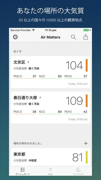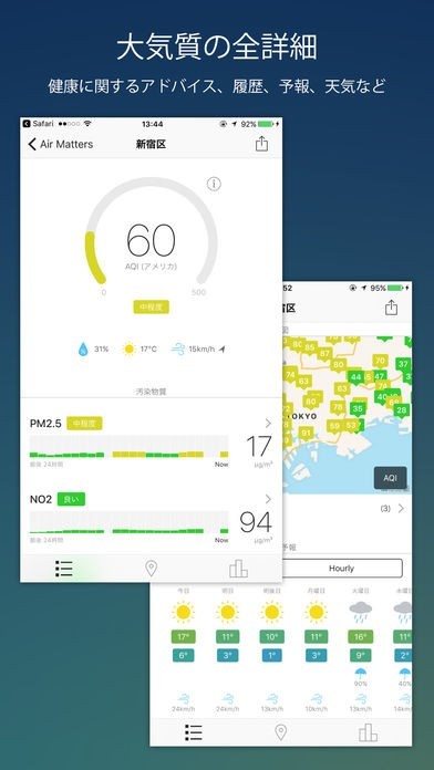 スマートフォンでリアルタイムな世界50か国以上の大気環境をチェックすることが可能となっていて、10000以上のモニタリングステーションによる詳細な情報を確認できます。