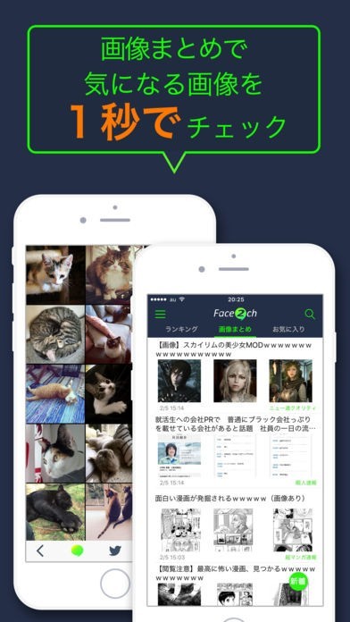「Face2ch」では、2ちゃんねるのまとめをラインのチャットのようなインターフェースで見ることが可能です。よって、他の人に見られたとしても、ラインをしているようにしか見えず、最悪の場合お仕事中などに見られたとしても被害を最小限に抑えることが出来ます。 さらには読み込みも早くサクサクとチェックすることが可能なので、短時間でたくさんの情報入手をすることが出来ます。 それ以外に、テーマを設定変更できるので、より見やすいようにすることができます。 加えて、「画像まとめ」によって、たくさんの画像を一画面でたくさんチェックしたりもできるので、お気に入りのものを見つけやすいです。