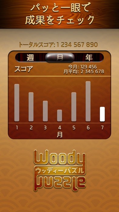 グラフ機能で、パズルゲームのスコア結果を管理できます。年月週に表示を切り替えられるので、スコアの変化の状態がわかります。高得点を出すのは難しいのですが、スコアの伸びがわかり、攻略法を考える時の参考になります。