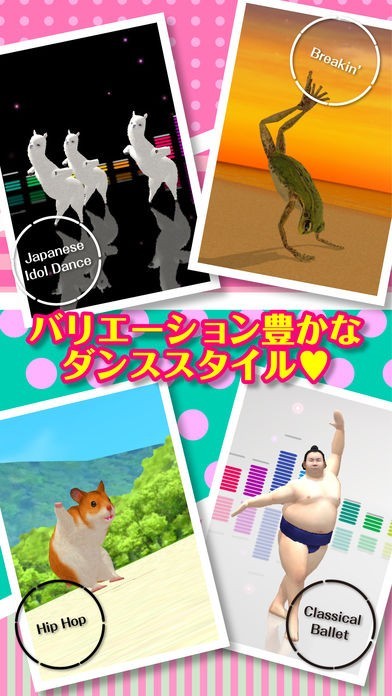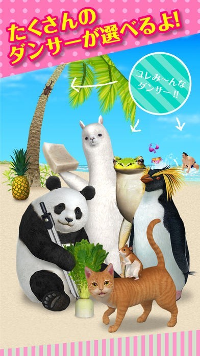 曲に合わせてアルパカや力士、パイナップルやカエル、ネコなどがキレッキレのダンスを披露してくれる音楽プレイヤーです。楽曲は演歌からクラシック、Jポップや落語まで選べ、それぞれに合ったダンスを見せてくれます。ダンサーやダンスをする場所は選べ、バリエーション豊かなダンススタイルで笑わせてくれます。AR機能を使えば、カメラで撮影している場所でダンサーが踊ります。ぜひ楽しい場所でダンサーたちを躍らせてください。