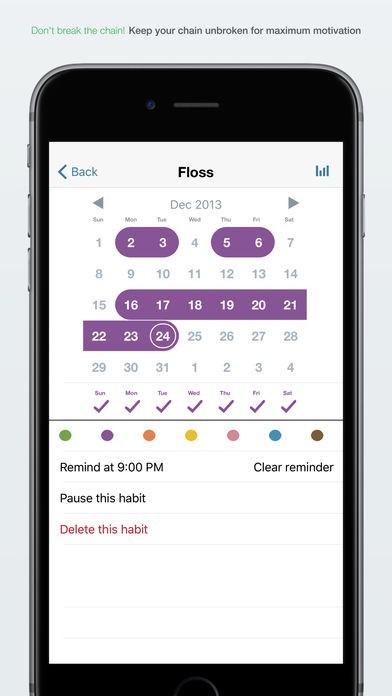 App Storeより引用Develop skills and keep your new year's resolutions by doing a little every day. Get into the habit and don't break the chain! This app is based on Jerry Seinfeld's advice and makes it easy to keep track of your daily habits, with reminders so you never forget what you have to do.
