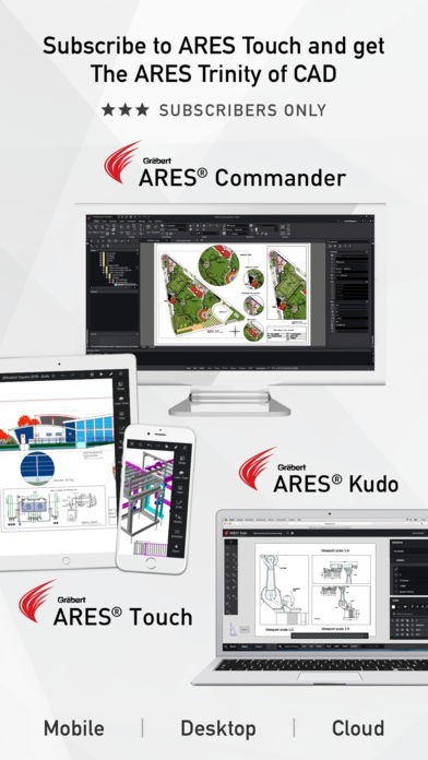 ARES Touchサブスクリプションは、ARES Commanderデスクトップ版(Windows版、Mac版、Linux版)とARES Kudo(クラウド版)に含まれています。ARES Commanderのサブスクリプション加入者であれば、登録しているGraebert アカウントでログインすることで、プレミアム版(フルモード)となります。サブスクリプションをお持ちでない場合は、ARES Touch および ARES Commander のサブスクリプション加入権を1ヶ月単位でアプリを通じて iTunes より購入(App内課金)できます。