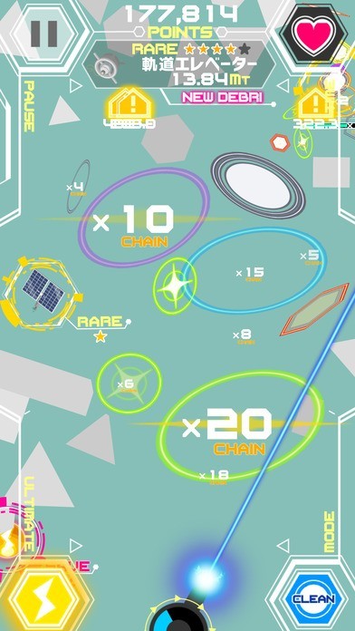 レーザーを発射してデブリを撃破していく爽快バトルシューティングゲームです。次々と飛来してくるデブリをレーザー兵器を駆使して倒していきます。ポップなデザインとは裏腹に頭を使って攻撃しなければいけないというパズル要素も備えています。画面の下部にある砲台から左右180度移動が可能な砲身を動かしタップすることでレーザービームを放つことができます。レーザーを放つとエネルギーが消費されるので、残量を確認しながら使いましょう。もしエネルギーがなくなってしまったとしても、極太なレーザーでデブリを蹴散らすことができる必殺技もあります。