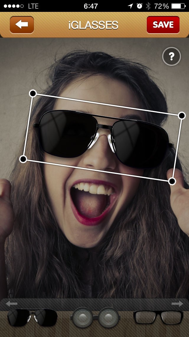 App Storeより引用今までのアプリとは違います。皆様にiGLASSESをご紹介いたします。100種類を超えるスタイリッシュなめがねを簡単に合成して保存しましょう。アルバムに保存してメールで友達に送信、Twitter、Facebookを通じてたくさんの人と共有しましょう。あなたの新しい一面を発見してみてください。