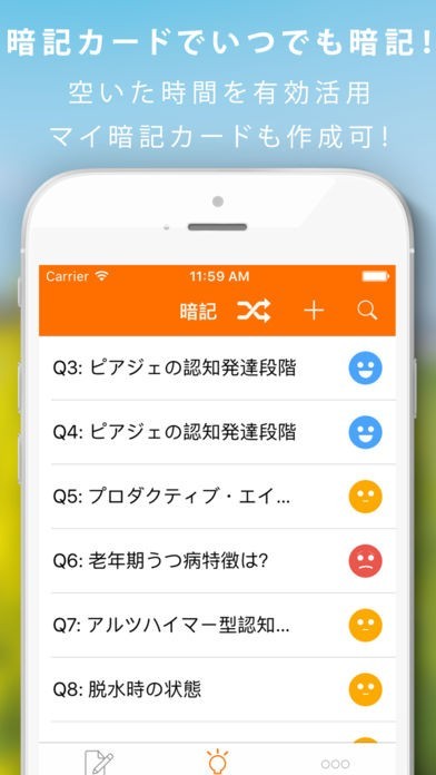 アプリ内には介護福祉士国家試験に必要な知識が学べる多数の暗記カードが収録されています。オリジナルの暗記カードを追加することも可能です。試験直前の復習の際にも役立ちます。