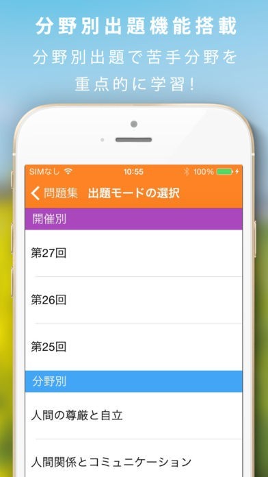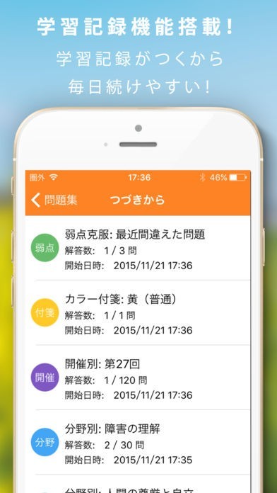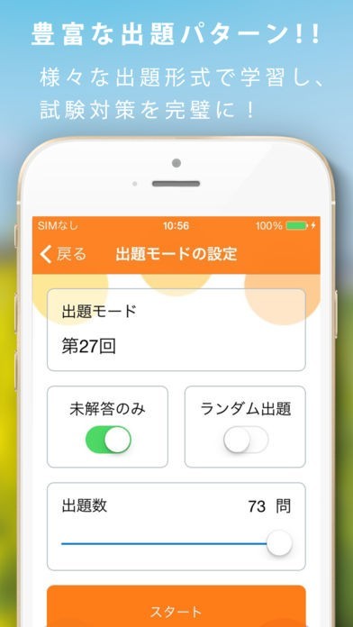 本アプリでは出題モードを細かく設定することができ、未解答のみ、ランダム出題、出題数といった項目を設定することで自分にあった効率的な学習がおこなえます。成績機能も充実しており、回答率や正解率、苦手分野の分析などが可能です。