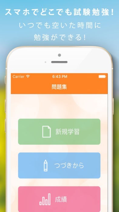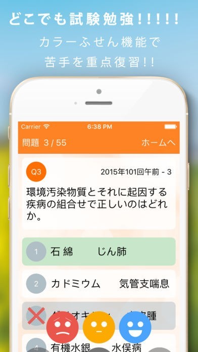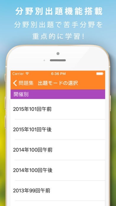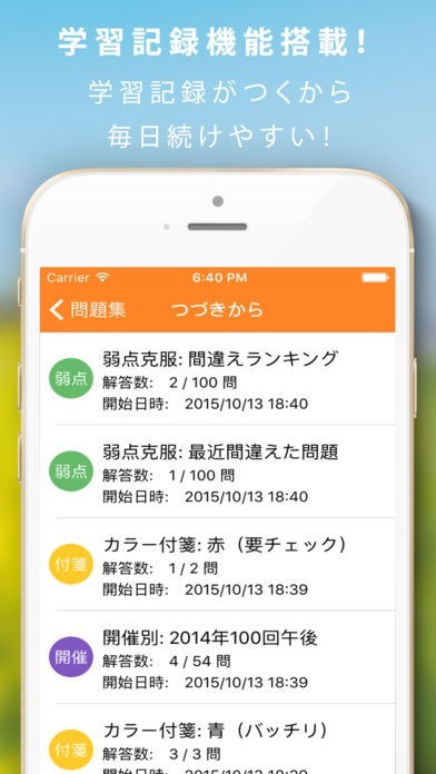 開催別、分野別、苦手な問題などから独自の問題セットを作成することができ重要な項目を徹底的に勉強できます。復習用にカラー付箋(ふせん)を使用したり、間違い回数が多い問題だけを解けるのでスキマ時間に、いつでも、どこでも効率的な学習が可能です。成績機能も充実しており、解答率、正解率、分野ごとの分析されます。