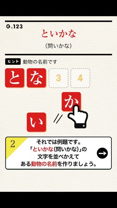 ひらがなを並べ替え、別の言葉を作って遊ぶゲームです。頭の体操にピッタリで、ひらめきや思考力が必要です。問題が解けた時に頭がスッキリするアハ体験をしてみましょう。