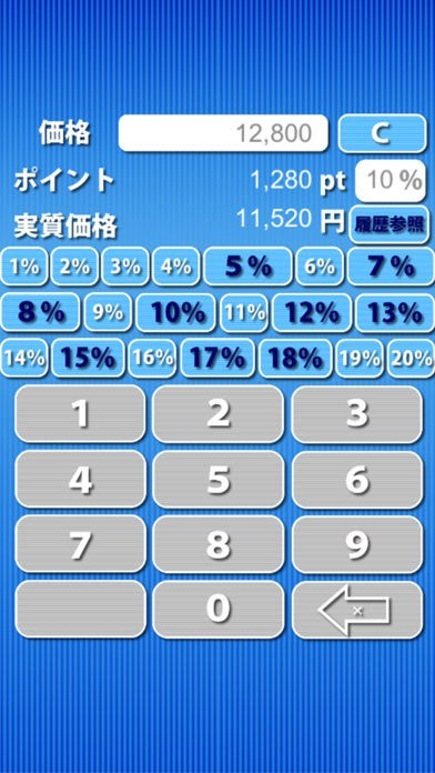 最大で20%までポイント設定ができるので、多くのポイントが付く商品に対応可能です。一度ポイントを計算した後にボタンを押すと、計算結果を電卓画面に戻すこともできます。