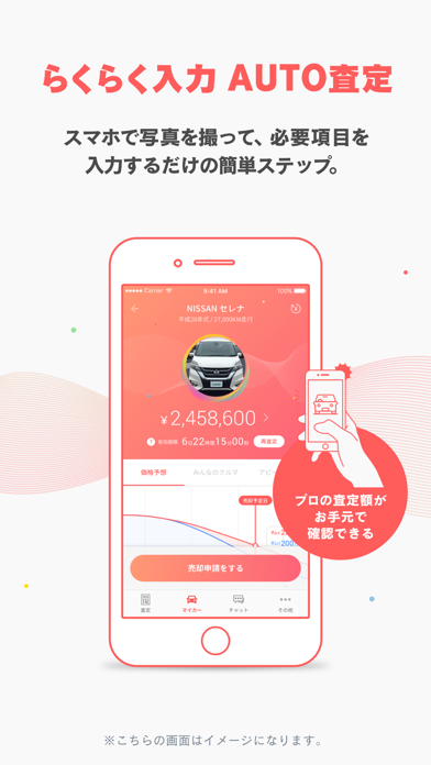 プロの査定が自分でチェックできる中古車査定&売却アプリです。査定方法は、写真を撮って、質問を入力するだけのラクラク操作で、その場で査定額をチェックすることが可能です。さらに、アプリからプロの査定士にチャットで相談できるから、輸入車・希少車・現状事故車など、あらゆるおクルマの査定に対応しています!