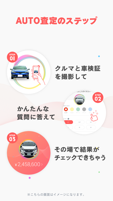 ・ 車の写真を撮って、かんたんな質問を入力するだけの自動査定機能です。
