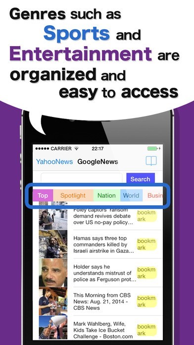 Googleニュースは政治、スポーツ、エンターテイメントなど10種類のジャンルに、Yahooニュースは8つの種類にジャンル分けされています。それぞれのカテゴリから自分の読みたいニュースを選んでタッチするだけの簡単な操作で閲覧できます。