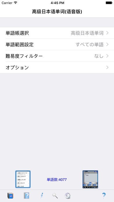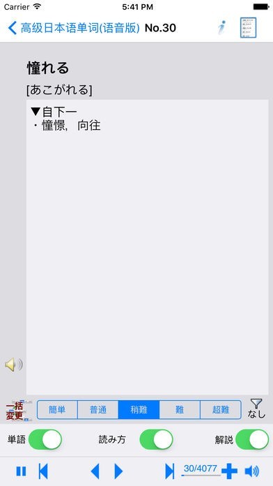 App Storeより引用精选相当于日本语能力考试一级水平的4000多词,全部附有日本播音员标准发音。