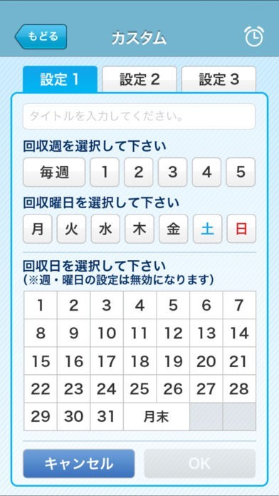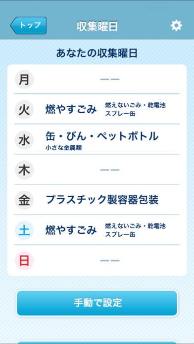 ごみの収集曜日を分別ごとに設定し、端末に同期しているカレンダーに反映することができます。お住まいの地域独自のパターンに合わせて設定した収集曜日を、一覧で表示できます。収集曜日のお知らせ機能もあります。
