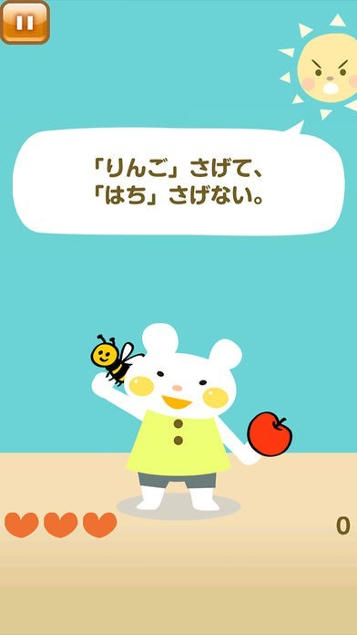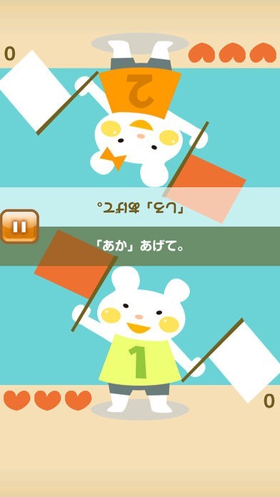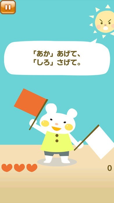 画面上に出てくる文字通りに旗を上げたり下げたりして遊ぶことができます。他にもりんごなど15種類のアイテムを左右の手に持たせてプレイすることもできるので、楽しめます。