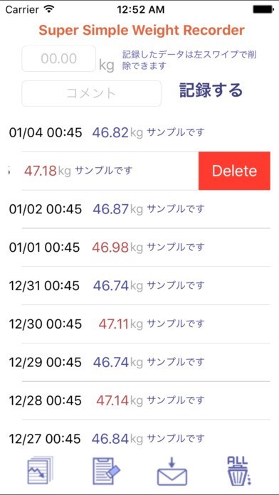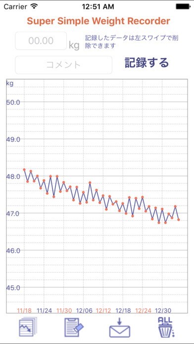 ダイエットなどの体重管理をしたい時に便利なアプリが「超シンプル体重記録」です。機能はシンプルで、体重を計った時に記録するだけです。体重と一緒に少しのコメントを掲載できるので、間食などを記載すると便利でしょう。記録していった体重は、グラフ化で表示させることができるので、どれくらいの期間でどの程度体重が減っているかもすぐに確認することができます。記録したデータはメールで送ることもできるので、自身の体調管理の際にも便利でしょう。