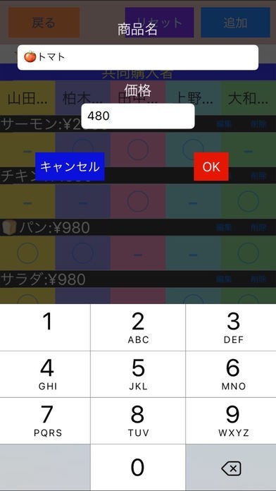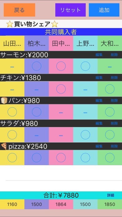 商品ごとに買った人で金額を割って合計誰がいくら払えばいいか集計してくれる