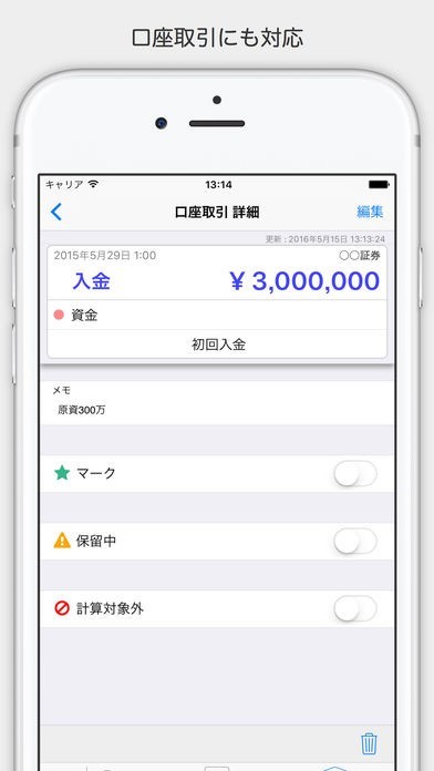 record FXでは複数のFX口座の運用に対応しており、スワイプ操作で口座を切り替えることができて便利です。また取引の記録にはラベルやマークをつけることが可能です。