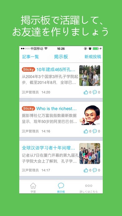 アプリの掲示板で、世界中の中国語を学んでいる人と繋がれます!