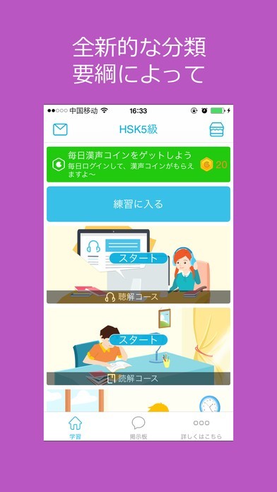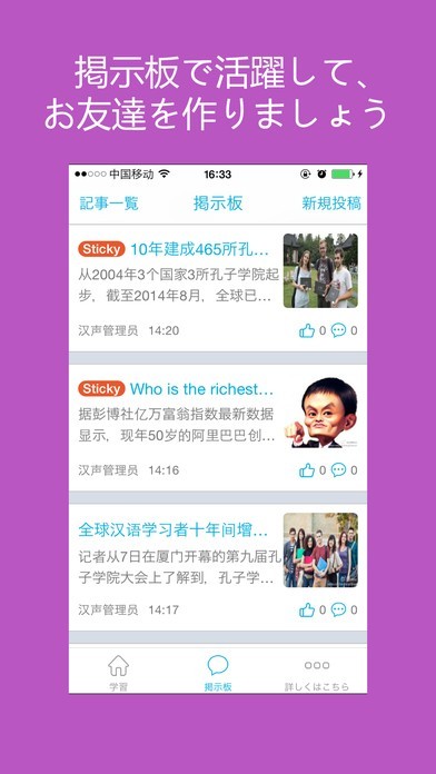 中国語を話せる人と勉強していても話すことができない人の違いは普段から実践的な形式をイメージして自己学習に取り組んでいるかがポイントとなります。例えば、どんなに難解な中国語の文法をマスターしたとしても実生活で使える中国語が頭の中に入っていなければ思うように中国語が口から出てこないのです。このアプリを使えば、日常生活で思わず中国語を話してしまうようなカリキュラムが用意されています。また、掲示板機能を使えば同じく中国語に取り組んでいる友人が増やせます。