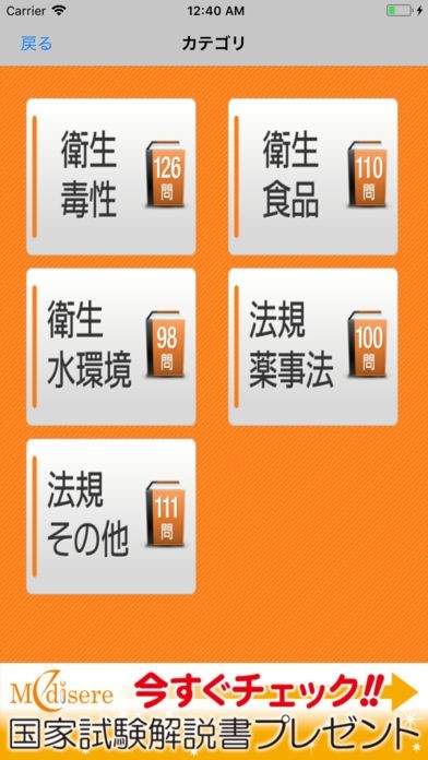 本アプリケーションには衛生・法規分野の問題545問が収録されています。 各問題に対する丁寧な解説付きで本格的な学習が可能です。 スマートフォン向けに最適化したインターフェースで、移動時間中など時間・場所を選ばず国家試験対策が可能です。 また各問題の正答率を記憶する機能を備えており、弱点対策にも非常に有効です。