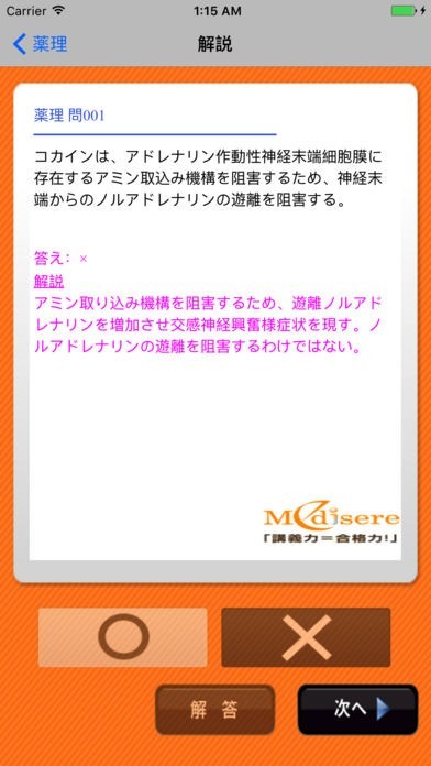 App Storeより引用【薬剤師国家試験予備校 メディセレ監修】 薬剤師国家試験合格を目指す薬学生を支援するためのアプリケーションです。 本アプリケーションには薬理・治療分野の問題672問が収録されています。 各問題に対する丁寧な解説付きで本格的な学習が可能です。 スマートフォン向けに最適化したインターフェースで、移動時間中など時間・場所を選ばず国家試験対策が可能です。 また各問題の正答率を記憶する機能を備えており、弱点対策にも非常に有効です。