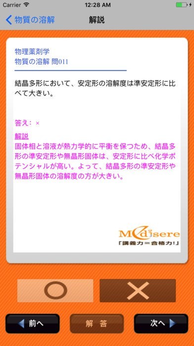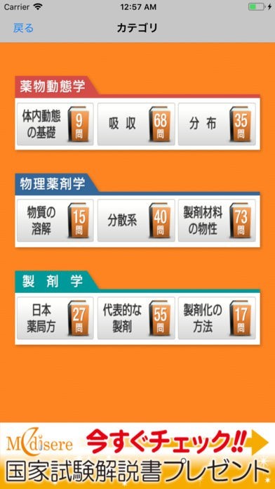 App Storeより引用【薬剤師国家試験予備校 メディセレ監修】 薬剤師国家試験合格を目指す薬学生を支援するためのアプリケーションです。 本アプリケーションには薬剤分野の問題339問が収録されています。 各問題に対する丁寧な解説付きで本格的な学習が可能です。 スマートフォン向けに最適化したインターフェースで、移動時間中など時間・場所を選ばず国家試験対策が可能です。 また各問題の正答率を記憶する機能を備えており、弱点対策にも非常に有効です。