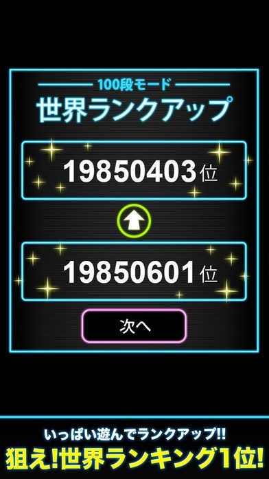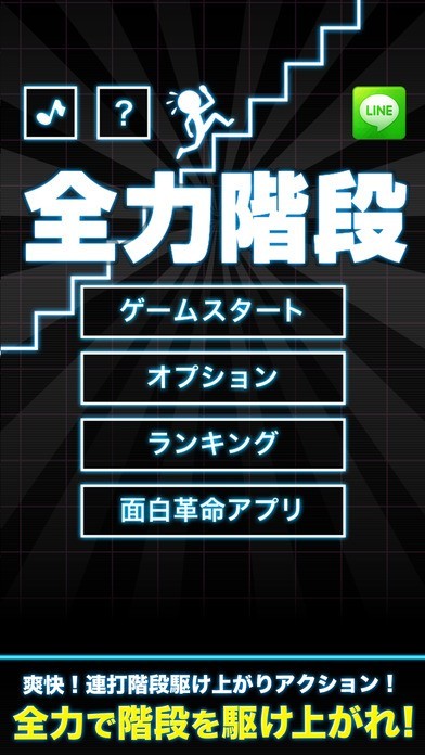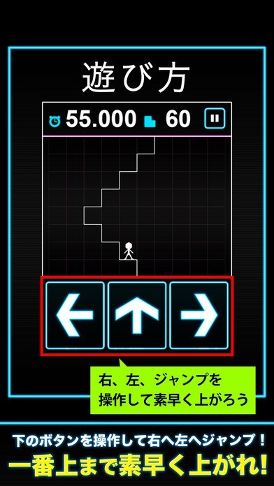 全力で階段100段を上っていくゲームです。上・右・左の3種類の矢印があり、矢印をタップすることでそれぞれジャンプ・右・左に階段を上っていきます。この操作を100回連続で行います。右か左をタップして階段のない方向に行ってしまうと階段から落ちてゲーム―オーバーになります。上は間違って押しても大丈夫です。 100段上りきってゴールするまでのタイムを競い、ランキングも用意されています。一つ上の順位までのタイム差も表示されるので分かりやすいです。