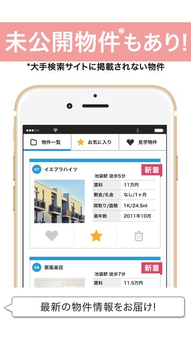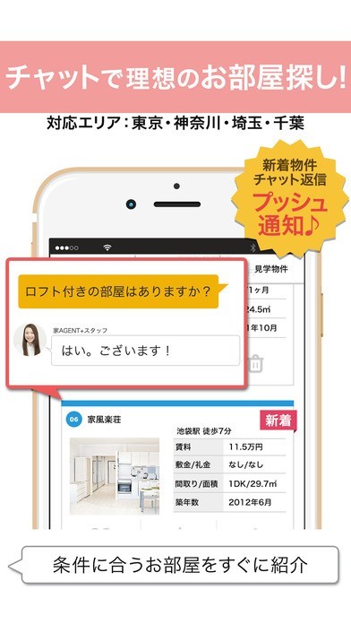 このアプリを使えば、チャットによって条件を入力していくことによって、お目当ての住宅を紹介してくれます。細かなことまで質問することができるので、事前にしっかりと希望を伝えることでミスマッチが起きる可能性を限りなく減らすことが可能です。 ただし、対応エリアは東京を始めとして、一部分のみなので、そこに住もうと考えている方のみがターゲットとなります。 深夜0時まで相談することができることから、仕事が終わってからでも物件探しが自宅で行えるので、忙しいサラリーマンの方でも役に立ちます。 加えて、気に入った物件を発見したら、「見学予約」をタップすることによって、日程を相談して、すぐに見学することができるので、気楽に見に行くことができます。