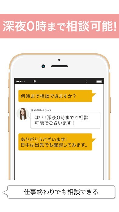 チャットによって希望条件などを入力することによって、お目当ての住宅を紹介してくれるという特徴のアプリなので、忙しくて不動産屋に行くことができないサラリーマンの方に向いています。 細かなことまで質問することができるので、例えば通勤時間、最寄り駅、家賃などの自分が求めている条件を事前にしっかりと伝えることで自分が求めていたものと違うものを紹介される可能性を限りなく減らすことが可能です。 加えて深夜0時まで相談することができるので、毎日残業で遅くまで仕事をしている場合でも物件探しが行えます。 加えて、気に入った物件を発見することができたら、「見学予約」をタップするだけで、日程を相談してすぐに見学することができるので、不動産屋へ一切行かずに住宅を見に行くことができて時間の節約になります。