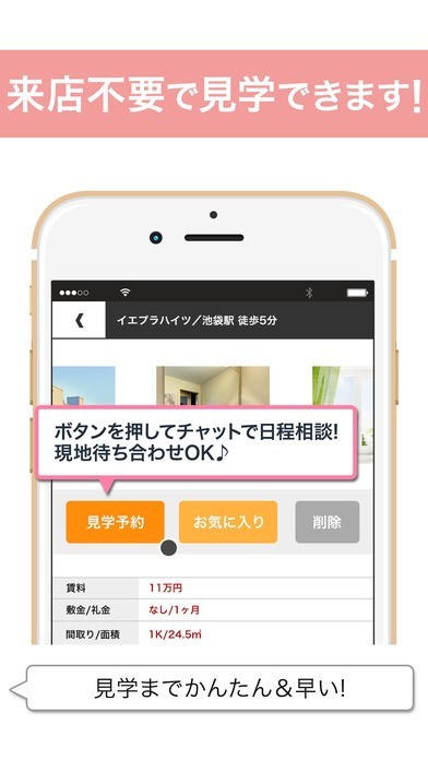 気に入った物件を発見したら、「見学予約」をタップすることによって日程を相談してすぐに見学出来る!