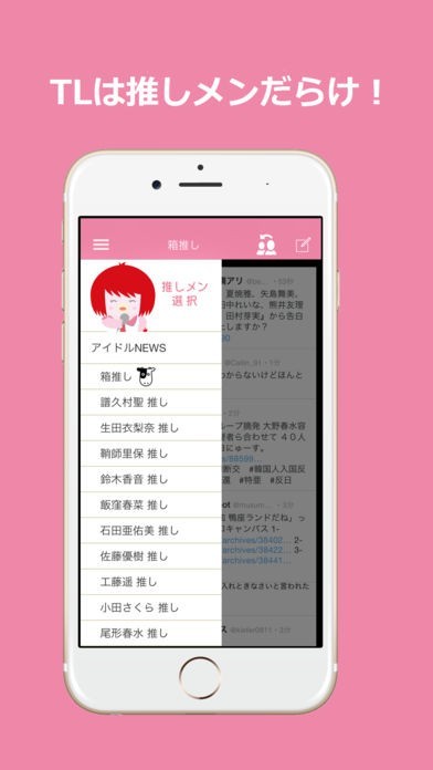 ツイッター機能ではあなたが選択した推しメンに関するつぶやきだけをワンタッチでタイムラインに表示します。もちろん、あなたが箱推しならば全メンバー、グループ全体に関するツイートも表示します。