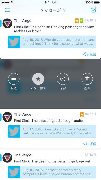 従来のメールアプリのように、メールのチェックや返信を、いちいちタップして画面を切り替えながら行う必要はありません。たまりにたまった未読メールの束も、スクロールしながら一気に読んでしまうことができますよ。シンプルなUIで余計なデザインが含まれていないのも、使いやすいですね。