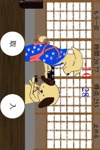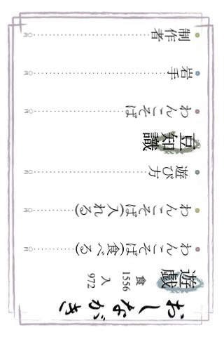「岩手わんこそば #47app」は岩手名物わんこそばをテーマにしたアプリで、その名前にちなんで登場キャラがイヌ(ワンコ)に統一されています。おしながきの画面でコンテンツの選択となりますが、ゲームモードは食べる方と給仕側のどちらかです。画面下の丸いボタンでアクションを選択し、タイミングのミスで減点される仕組みとなっています。食べる方は貰、運、食の3ボタン、給仕は取、入の2ボタン操作です。どちらのモードも制限時間がありますので、ミスを少なくリズミカルに進めていくことがポイントとなります。また、ご当地ゲームのこだわりとして、岩手とわんこそばに関する豆知識も収録されています。