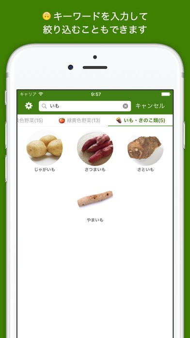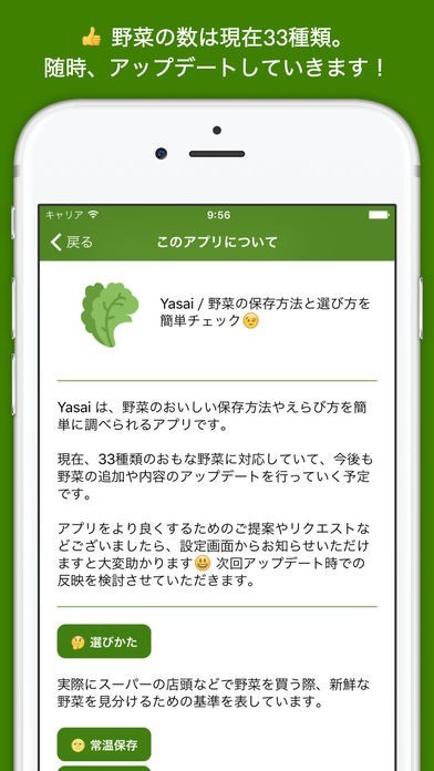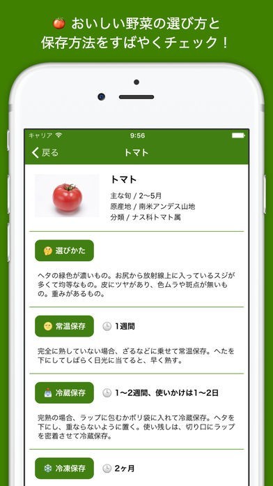 野菜の選び方や保存方法がイマイチわからず、いつも野菜を悪くしてしまう方に必見のアプリです。野菜名を選択するだけで、選び方や美味しさを新鮮に保つ方法が分かります。