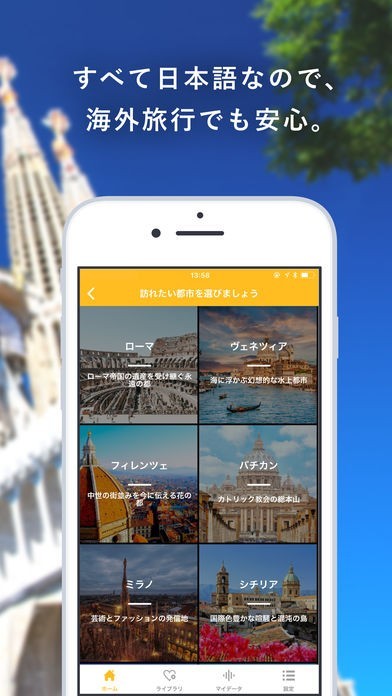 国内・海外旅行ともに対応している音声ガイドアプリで、現地ガイドが案内するのと同様のガイドを聞くことができます。全てのガイドが日本語に対応しているので海外の情報でも利用できます。